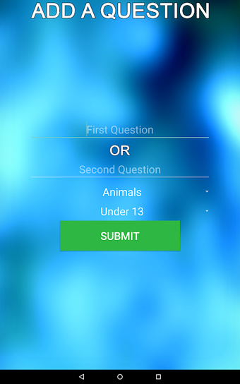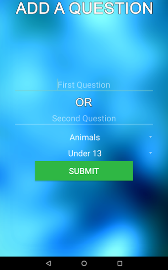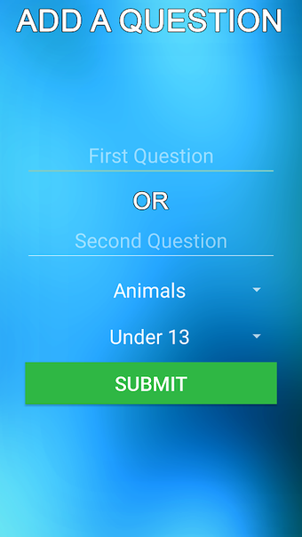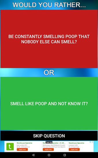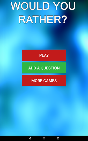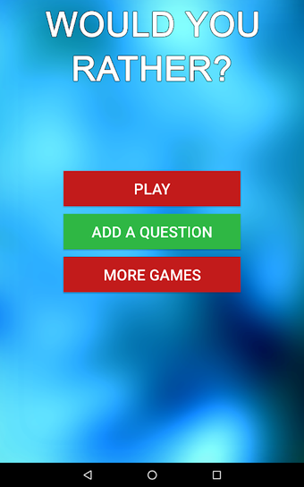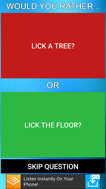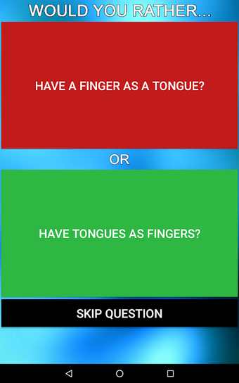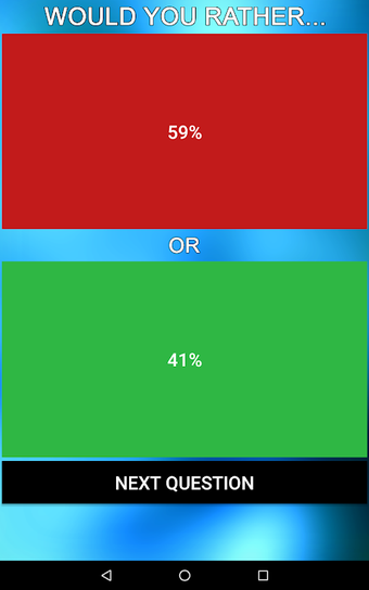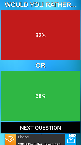 Would You Rather هي لعبة اختبار تقوم على مفهوم بسيط: اختر أهون الشرين. يحتوي الاختبار على آلاف الأسئلة للتأكد من أنك ستستمتع باللعبة وأن تكون مدمنًا عليها. إنها لعبة رائعة لأي مناسبة ولجميع الأجناس والأعمار. إنها أيضًا طريقة رائعة لتعلم أشياء جديدة والاستمتاع في نفس الوقت. تطبيق الاختبار سهل الاستخدام للغاية. كل ما عليك فعله هو النقر على زر لاختيار الإجابة. يتم تقديم الإجابات لك بترتيب عشوائي. يمكنك اختيار الإجابة عن طريق النقر عليها. يمكنك أيضًا النقر فوق الإحصائيات لمعرفة كيف أجاب المستخدمون الآخرون على نفس السؤال.